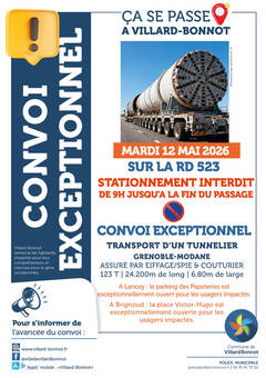 Mardi 12 mai 2026, un convoi exceptionnel traversera la commune de Villard-Bonnot. Le stationnement sur la RD523 sera interdit à partir de 9h jusqu'à la fin du passage.