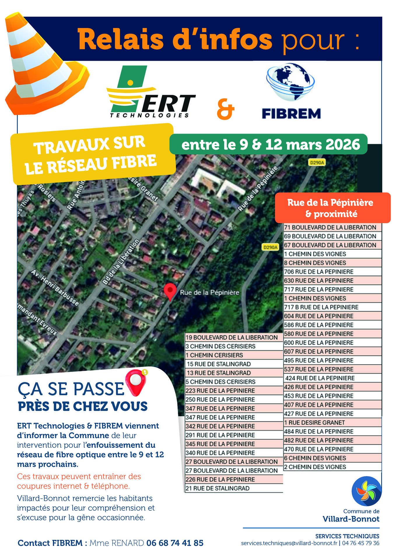ERT Technologies & Fibrem viennent d’informer la Commune qu'ils procèderont à l’enfouissement du réseau de fibre optique dans la rue de la Pépinière et alentours, entre le 9 et 12 mars prochains.